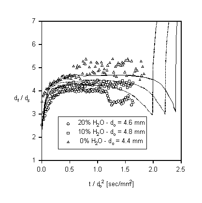 Isolated liquid droplets of methanol, two methanol/water mixtures, two n-heptane/hexadecane mixtures, and an n-dodecanol/methanol mixture were burned. Princeton was especially involved in the experiments on methanol and methanol/water mixtures and some current comparisons of data with numerical modeling results generated at Princeton are shown below.
