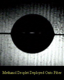 Successful experiments were conducted using methanol, methanol/water, mixtures, methanol/dodecanol mixtures and heptane/hexadecane mixtures in both stagnant and forced convection environments. Shown above is a back-lit image of a methanol droplet during combustion. The back-lighted image of the droplet was video-recorded as a function of time. An approximate "flame position" surrounding the droplet could also be estimated from the video images, since the flame heating caused the supporting silicon fiber to radiate. Data from the video images were then reduced to obtain the square of the droplet diameter, ds, and the ratio of the flame diameter to the droplet diameter, df/ds as a function of time. The data were reduced using imaging and data reduction techniques by NASA-Lewis personnel, and a NASA-Technical will report all test results will appear in mid-1997.![]()