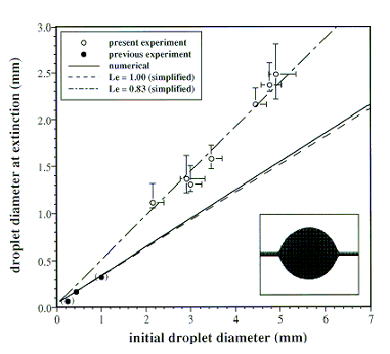 This figure is from Dietrich and co-workers(1996). The numerical prediction is that obtained without considering non-luminous radiation (discussed below), and the dashed lines are results of rate ratio asymptotic analyses performed at the University of California, San Diego by Zhang and Williams. Note the inserted image of the droplet at extinction. The droplet is not exactly spherical because of the presence of the supporting fiber, and this result causes some inaccuracies in terms of the desired spherical nature of the experiments, particularly for droplets of less than 3.0 mm in diameter. For larger sizes (~4 to 5 mm), the effect of the fiber on drop geometry is negligible.
