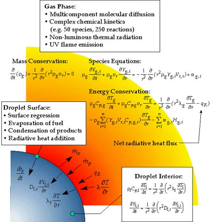 To model the effect of non-luminous radiative heat loss from the droplet flame, the gas phase conservation of energy was modified to include the net radiative heat flux. A Planck-mean absorption coefficient was calculated locally in space and time, from the calculated gas phase temperature and mole fractions of carbon dioxide, water and carbon monoxide. Radiative heat addition at the droplet surface is also included. The differential terms solved in the model are shown in the figure on the left. These equations are solved time dependently using a moving finite element technique. Calculations are performed on workstations and take up to a 100 hours, depending on the initial size of the droplet. calculations are initiated by pre-vaporizing the droplet and then imposing a spherical high temperature "shell" surrounding the drop. The calculation then proceeds through all of the remaining phases of the phenomena until droplet flame extinction occurs.