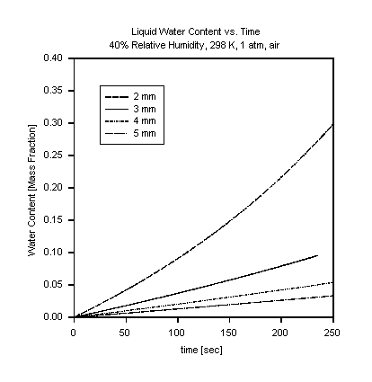 Since the experiments were conducted manually, the methanol and methanol-water drops that were studied were exposed to humid air for some time before they were ignited. Water could be absorbed from the humid air, raising the possibility that the amount of water within the droplet may be different at ignition than what was in the liquid used to form it. Below, is a graph showing how much water would be absorbed from the quiescent environment (surrounding the drop) as a function of time.The effect of radiative heat loss from isolated droplet flames is usually assumed to be negligible. For the small droplet sizes studied in most isolated droplet combustion experiments conducted to date (the order of 1.0 mm and smaller), this assumption has been shown to be reasonable. For example, by neglecting radiation, a detailed numerical model accurately predicts the burning rate, flame position and extinction diameter for 1 millimeter-sized methanol/water droplets. However, recent space-based 3 to 5 millimeter methanol/water droplet combustion data show an increase in extinction diameter and a decrease in burning rate with increasing initial diameter. These results suggest that, at larger initial droplet diameters, the effect of radiative heat loss cannot be neglected. Accordingly, a non-luminous thermal radiation model has been added to the time-dependent moving finite element model developed previously at Princeton University.