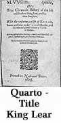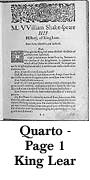 Eighteen of Shakespeare's 37 plays are extant in single-play editions published during his lifetime. These early editions are called quartos, because the printer folded a single sheet of paper into quarters, producing eight sides to print on; the result was a small, relatively cheap book. We do not know how the printers obtained the copy for these quartos. They vary greatly in quality; some seem to be accurate, others wildly inaccurate. Of the plays you read in Lit 131, there are quarto editions of A Midsummer Night's Dream, 1 Henry IV, Henry V, and King Lear.