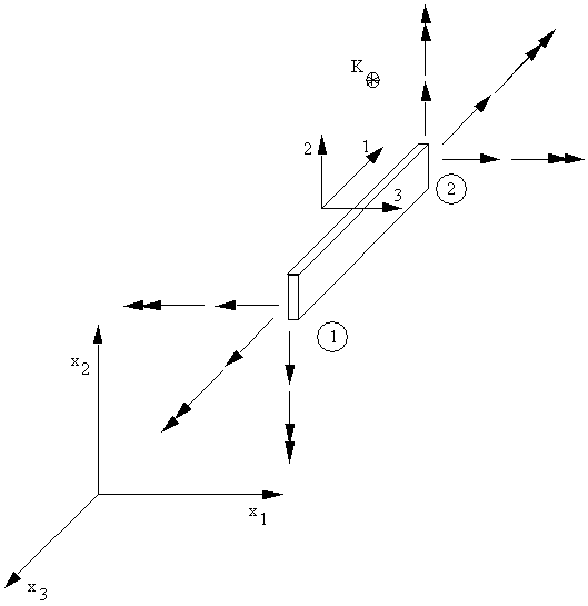 Truss elements connect two points in space and transmit axial forces only. There are three possible degrees of freedom at each of the two nodes, i.e. the x1, x2, and x3 translations.