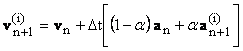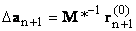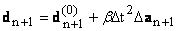 where M-1 denotes the inverse mass matrix. With the solution fully characterized at time t0, the objective is to compute the solution at time t1, then at time t2 and so on. Numerous algorithms are available for that purpose. DYNAFLOW uses one-step methods to carry out the time integration by assuming auxiliary relationships between the solution vectors at time steps tn and tn+1. For second-order systems, the Newmark update formulas [see Section 12.3] are used: