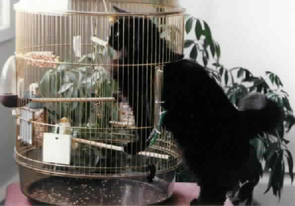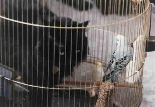 This does look an assault on a poor innocent bird in a cage; but appearances are deceptive: the two were friends: