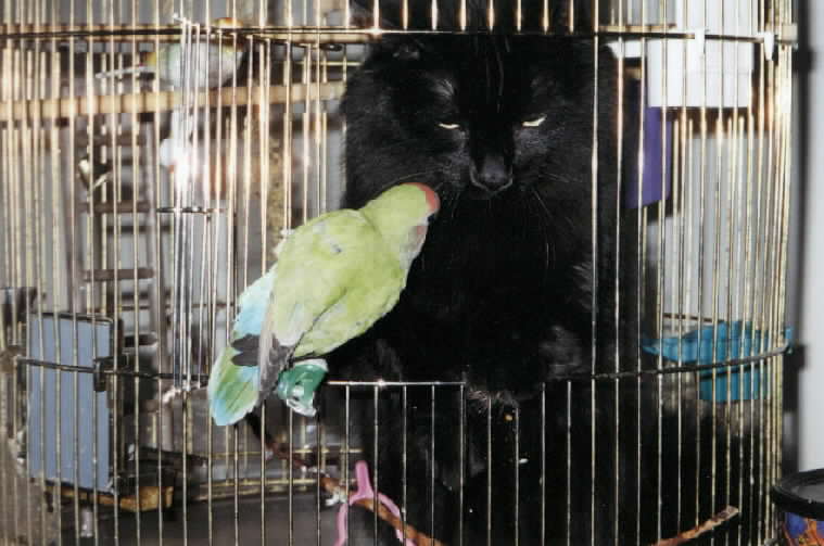 The little parakeet in these pictures came to a tragic end, at the hands of another cat, when she escaped the house last summer. But Gina now has another bird, a little parrot called Nika: