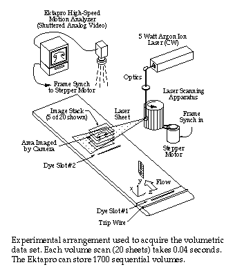 The flow studied was a turbulent boundary layer with a Reynolds number based on momentum thickness of 700. The experiment was done on a flat plate in a water channel facility. The flow was seeded from two dye slots with disodium fluorescein dye. The dye was illuminated using an innovative laser scanning apparatus developed during the course of this research. The scanner sweeps twenty parallel laser sheets at high speed through a region of the boundary layer. Up to 1700 sequential volumes, each consisting of 20 laser sheets, can be acquired during one experiment. The imaged laser sheets are digitized and stored, and can be rendered in software from any angle. The rendering algorithm includes parallax, transparency and depth-cueing. Pairs of views corresponding to binocular vision can be combined to construct stereoscopic visualizations of the data set. These stereoscopic images can be displayed as a time series, in the form of a 3-D movie. The figure below shows the experimental setup used to gather the data set.