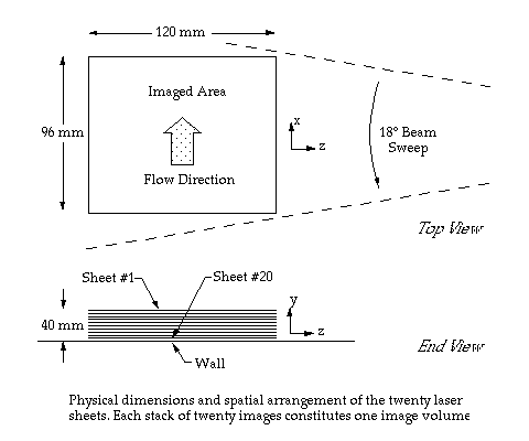 Dimensions of the Volume Studied The flow studied was a turbulent boundary layer with a Reynolds number based on momentum thickness of 700. You may return to the data set acquisition menu or go to the stereoscopic visualization menu.