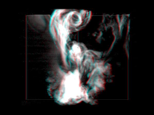 This is the same data set as the previous stereogram. Flow is from bottom to top. The Reynolds number based on the diameter of the jet and the freestream velocity is 3800. The ratio of the jet velocity to the freestream is about 4. Marked boundary layer fluid is lifted from the floor and entrained into the wake of the jet.