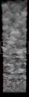 Data courtesy J. Brasseur and P.K. Yeung, the Pennsylvania State University The flow is from bottom to top. The Reynolds number based on momentum thickness at the midpoint of the volume is 700. A passive scalar has been introduced into the flow along a spanwise line at the bottom of the picture. The spanwise scale has been expanded by a factor of 3 for clarity. This is the full computational domain of a direct numerical simulation of a developing turbulent boundary layer. The next stereogram is a closeup of the boxed region at the center of the picture, or you may return to the Stereoscopic Visualization menu.