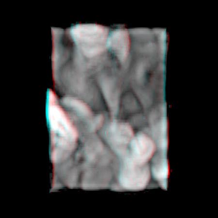 Data courtesy J. Brasseur and P.K. Yeung, the Pennsylvania State University The flow is from bottom to top. The Reynolds number based on momentum thickness is 700. The scale of the image is the same as in the top view of the experimental data set. The next stereogram is a perspective view of this volume or you may return to the Stereoscopic Visualization menu.