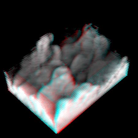 Data courtesy J. Brasseur and P.K. Yeung, the Pennsylvania State University The flow is from lower left to upper right. The Reynolds number based on momentum thickness is 700. The scale of the image is the same as in the experimental data set. You can continue on to see some additional stereograms, or you may return to the Stereoscopic Visualization menu.