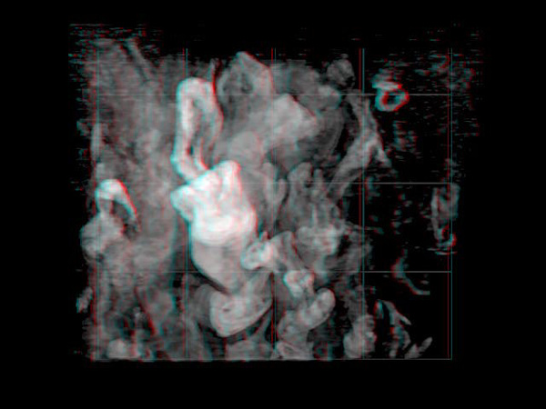 The flow is from bottom to top. The Reynolds number based on momentum thickness is 700. The same volume can be seen with coordinates and dimensions in the previous stereogram, the large coherent structure in the center may be seen in close-up in next stereogram, or you may return to the Stereoscopic Visualization menu