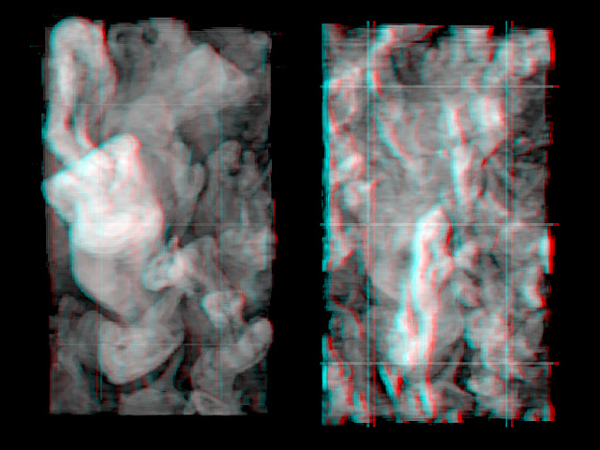 On the left is a top view of the coherent structure. Careful examination reveals a streak of fluid directly underneath the arch shaped structure towards the bottom of the picture. This streak is shown clearly in the bottom view on the right. The full volume containing this structure can be seen in the previous stereogram, from various angles in the next stereogram, or you may return to the stereoscopic visualization menu.