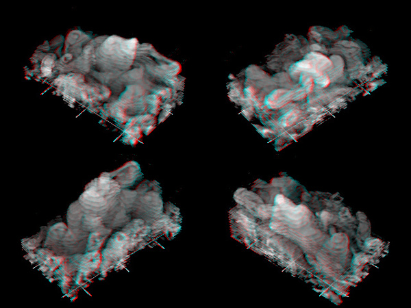 Flow is towards the center of the picture in each of these views. The full volume containing this structure can be seen in the top view, from another interesting angle in the next stereogram, or you may return to the Stereoscopic Visualization menu.