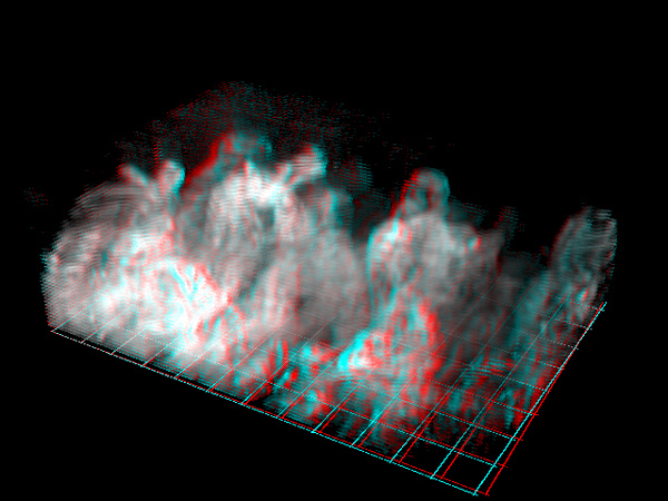 Turbulent Boundary Layer Flow is away from viewer towards the upper right. The Reynolds number based on momentum thickness is 525. This is from an early attemp at stereoscopic visualization, hence the detail and contrast are poor.