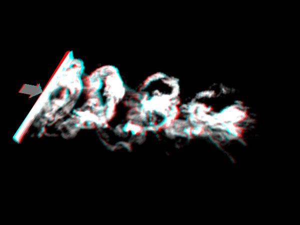 Flow is from left to right. The Reynolds number based on the diameter of the cylinder is 250. The ratio of cylinder length to diameter is about 12. Note the alternate shedding from the top and bottom shoulders of the cylinder, as well as the highly three-dimensional nature of the vortices. This is from an early attemp at stereoscopic visualization, hence the detail and contrast are poor.