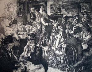 The artist described the scene in his diary, “The back room of Wallace’s … was a gathering place for artists, writers, and bohemians of Greenwich Village. The character in the upper right hand corner of the plate is Eugene O’Neill.”
