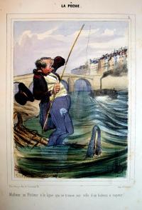 Various copies of one issue of Paris comique might contain different prints, as Maison Aubert had a stockpile and simply used whatever was convenient to finish the run. This used to make researching and viewing all of Daumier’s work difficult, as researchers often had to go to several libraries. Today, the broad scope of Daumier’s work can be researched on a free database written by Dieter and Lilian Noack, which records and images all of his 4,000 lithographs and 1,000 wood engravings. A search for lithographs about fishing results in 51 prints, with complete information and images, including the one shown here. Take a look: http://www.daumier-register.org/werklist.php?lingua=en&search=intro