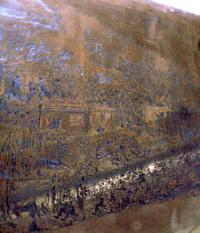 Princeton is fortunate to hold the steel printing plate for this etching. Although it is hard to photograph, I’ve posted a few images to give you an idea of the complexity of this plate. The iconography includes Albert Smith’s lecture on Mont Blanc, a prize cattle show (along with a beef dinner close by), emigration to Australia, and Harriet Beecher Stowe’s Uncle Tom’s Cabin. Although Princeton is sadly missing, the New York’s Crystal Palace can be seen at the top right just above a peace conference. Also depicted is the war between Russia and Turkey, spirit rapping, table turning, ceiling walking, John Gough and the temperance movement (see post December 2008), Charles Keen’s Sardanapalus, Captain McClure and the North-West Passage, and much more.