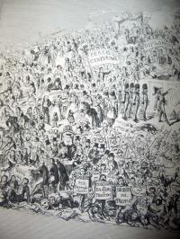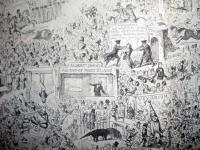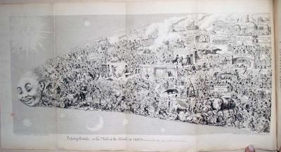 After the demise of The Comic Almanack in 1853 (see posting September 2008), George Cruikshank (1792-1878) tried to publish a magazine under his own name: Cruikshank’s Magazine. It only lasted two issues, January and February 1854, but opened with the spectacular fold-out “Passing Events, or, The Tail of the Comet of 1853.” This 15 ¼ x 7 inch sheet includes hundred of figures chronicling the events of the previous year.