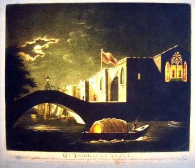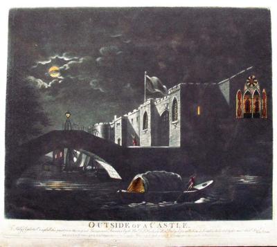 Jas. Hook, Outside of a Castle. To Lady Charlotte Campbell, this print from the original Transparent Drawing, 1798. Sold and published by Edwd. Orme, Conduit Street, London. Transparency etching.