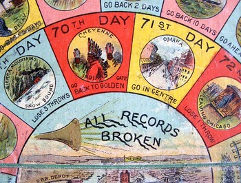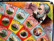 Composed of thirty-four hand-colored panels, the game follows closely on the thirty-six chapters or lectures published in Punch. There are six bed and five wedding ring squares that might set a player back. On square thirty-three, Mr. Caudle is dressed in mourning over the loss of his wife but in square thirty-four he is jumping for joy on the winning panel.