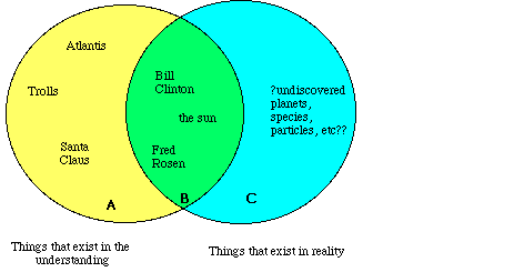 In the area marked A we have things that exist in the understanding alone; in the area marked B we have things that exist both in the understanding and in reality; and in the area marked C we have things that exist in reality but not in the understanding. (For obvious reasons, we cannot give any concrete examples of the last category.)