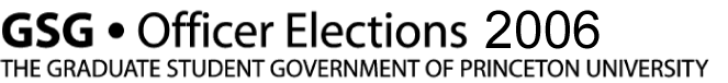The remaining Officer positions (Parliamentary Secretary, Corresponding Secretary, Recording Secretary, Press Secretary, and Social Chair) will be filled with elections by the GSG Assembly at the April 12, 2006 meeting. Anyone may run by announcing their candidacy at the meeting, or you can e-mail a candidate statement in advance to gsg@princeton.edu.