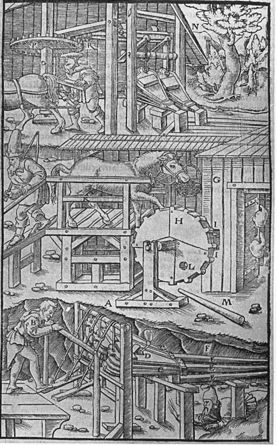 Agricola (Latin pen name of the German schoolteacher George Bauer) was a humanist and investor in German mines. His great work, De Re Metallica, carefully depicted and described all facets of mining from ores to mining machinery. Here depicted are three ventilation machines. At the top, a man and a horse turn the toothed wheel P, which in turn lifts the tops of a pair of bellows through the cams. In the middle, a horse, feeding from the basket, turns a wheel (H) with his forelegs to pump the bellows behind the structure G. At the bottom, a man treads on pedals to force air from the bellows to the crouching miner. A later wit quipped that Agricola's book had drawn more money from readers than had ever been found by mining.