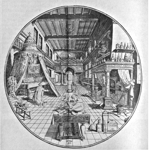 Khunrath depicts the alchemist in a metaphorical laboratory divided into an altar to the labor of alchemical practice and one to the Divine Word. The table of musical instruments bridges the alembics of the laboratory furnace and the books of divine revelation. The instruments are emblematic of the mathematical harmonies underpinning the natural order of the universe.