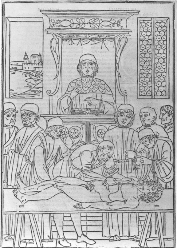 This woodcut is taken from a 15th century edition of Mondino's late-13th century text. It shows a lecturer reading the book while a demonstrator points to the appropriate body parts excavated by the barber-surgeon.