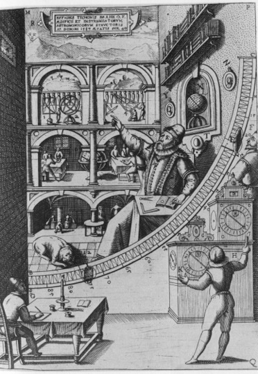 Brahe's mural quadrant was one of the largest astronomical instruments of its time. Each degree could be finely divided and accurately read, giving Brahe's observations the greatest accuracy before the advent of telescopic astronomy. The portrait of Brahe is painted onto the wall pointing toward the slit in the wall through which heavenly bodies were viewed. He is portrayed beneath portraits of his liege-lord and in front of a cross-section of his castle Uraniborg. Notice the astronomical instruments mounted on the roof, meeting rooms on the main floor, and an alchemical laboratory in the basement. Notice too that an observer looks through the quadrant's sights as one assistant calls out the time from clocks and another records the data.