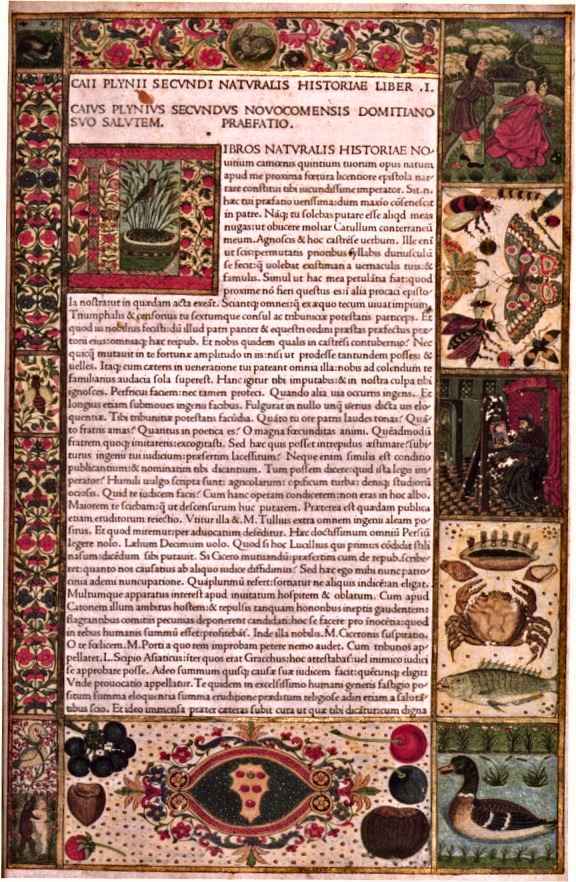 This is a page from the 1472 printing of Pliny's Natural History. Rich book owners (this appears to have belonged to the powerful Medici family) could have their printed texts hand-illuminated, now with very detailed illustrations. Notice among naturalistic figures of insects and acquatic creatures is the figure of an artist, perhaps drawing on the trope of art's imitation of nature.