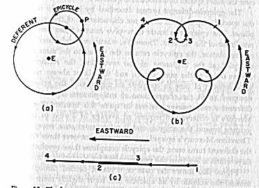 The basic epicycle-deferent system. A typical deferent and epicycle are shown in (a); the looped motion that they generate in the plane of the ecliptic is illustrated in (b); the third diagram (c) shows a portion (1-2-3-4) of the motion in (b) as it is seen by an observer on the central earth, E.
