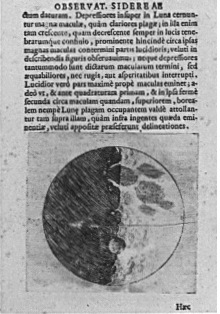 The Starry Messenger, published in 1610, introduced Europe to Galileo's telescopic observations of the night sky. While spots on the moon had not escaped notice, Galileo tried to show how bright spots on the dark side of the moon indicated mountains and valleys. Notice the continuing arc of the bright ridge on the top crater and the bright interior curve of the bottom crater. Galileo argued that this was proof that the geography of the moon resembled that of the earth and that it was not a perfect, incorruptible sphere.