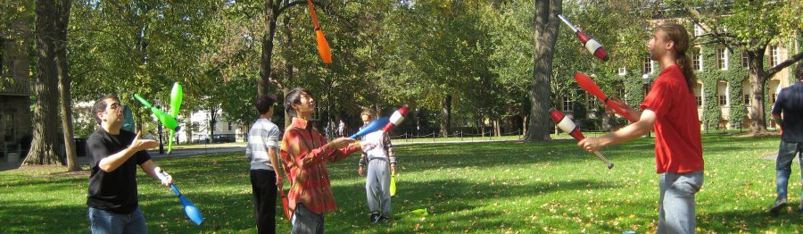 We are the official juggling club of Princeton University, located in Princeton, New Jersey. We are open to community members as well as students. Our meetings are once a week to simply hang out and have some fun juggling. Anyone is welcome, regardless of skill level - and if you don't know how to juggle, we'll be happy to teach you! Our members represent a wide range of juggling skill, from beginners, to some who have been juggling for years. Our weekly meetings are a great place to unwind and practice and pick up new tricks.