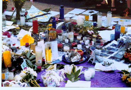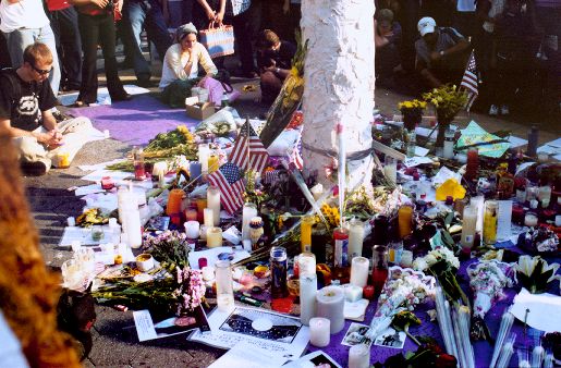 These are just a few of the items that people have placed around the column. Many of the pieces of paper contain images of people missing from the WTC and information about how to contact their families and friends.