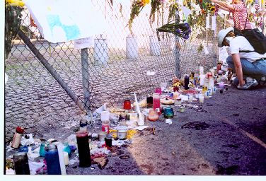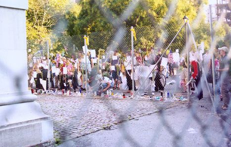 This is the memorial site that people have made in Washington Square Park. They've used the chain link fence that surrounds the arch (which is undergoing repairs) as the focal point.