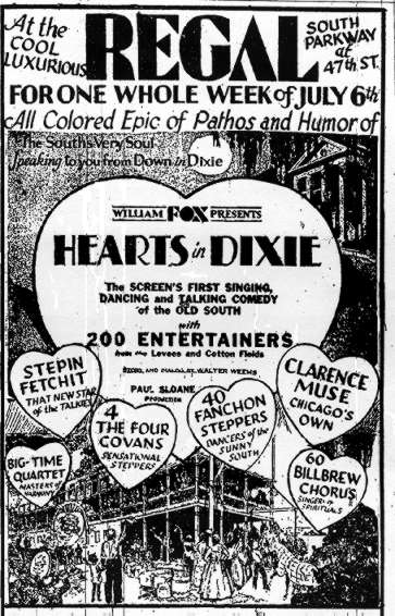 In the spring and early summer of 1929 American moviegoers were greeted with the release of two films that marked the beginning of a series of Hollywood "all-colored, all-talking" films. Fox's Hearts in Dixie, directed by Paul Sloane, starred Clarence Muse and Stepin Fetchit in a story that focused on religion in African-American life. Film historian Thomas Cripps writes, "The plot of Hearts in Dixie is simple: a tale of old Nappus, a black tenant who scratches a meager living from worn soil; his daughter Chloe, wife to shiftless Gummy; and their two children, Chiquapin and Trailia.… [We see] inside the cabin where beautiful, careworn Chloe sees to the children. She sleeps a bit and dreams of a black cat, an omen that brings swamp fever to her and to Railia, forcing Nappus to choose between the white doctor or the conjure woman. In rich lights and darks with striking panache he persuades the doctor, the film's only white, to come to the cabin. Foreshadowed by a dance-ritual, Nappus and the doctor come upon a voodoo rite that Gummy has allowed to be chanted over his dying family (Cripps 1977, 239-240)."