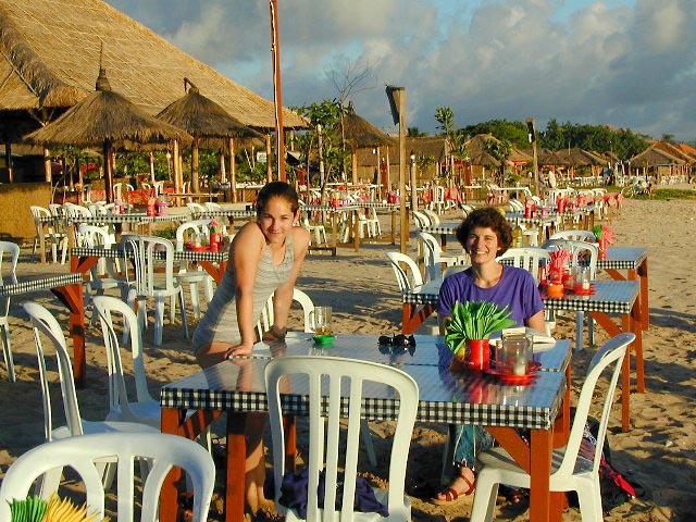 We got a table on the beach where we ate spicy grilled fish and watched the sun set over the ocean while Becca, Ari, and Max played with some local children. Communication between the kids was limited. When Becca asked a boy how old he was, he smiled and said "yes." During dinner, we were seranaded by musicians who played Beatles music, singing in strong Indonesian music. Lee started singing along in the same accent which made the kids laugh.