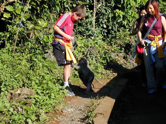 We went to a Hindu temple on a sea cliff that was guarded by wild monkeys. We bought food to feed the monkeys, but this one monkey couldn't wait and started to attack Ari to get the food. (We all had to wear yellow sashes because yellow is a holy color and the sash separates our upper spiritual self from the more earthy lower self).