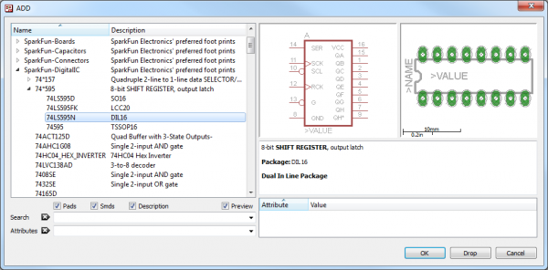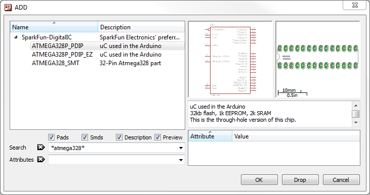 The ADD tool also has search functionality: very helpful when you have to navigate through dozens of libraries to find a part. The search is very literal, so don't misspell stuff! You can add wildcards to your search by placing an asterisk (*) before and/or after your search term. For example if you search for atmega328 you should find a single part/package combo in the SparkFun-DigitalIC library, but if you search *atmega328* (note asterisks before and after), you'll discover two more versions of the IC (because they're actually named “ATMEGA328P”). You'll probably want to get accustomed to always adding an asterisk before and after your search term.