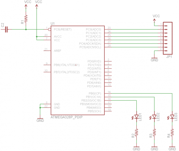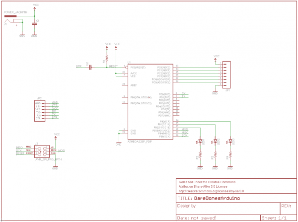 The schematic from previous tutorial, complete with an ATmega328P, barrel jack connector, LEDs, resistors, capacitors, and connectors.