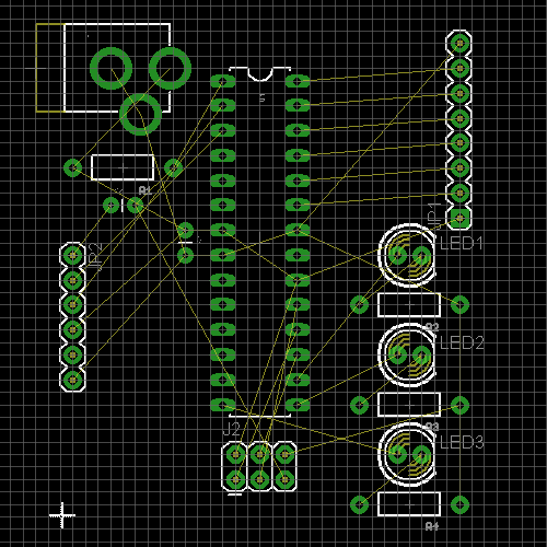 – to get the airwires to recalculate.Below is an example of how you might lay out your board while considering those factors. We've minimized airwire intersections by cleverly placing the LEDs and their current-limiting resistors. Some parts are placed where they just have to go (the barrel jack, and decoupling capacitor). And the layout is relatively tight.
