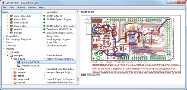EAGLE is packaged with a handful of nifty example PCB designs. Open one up by expanding the “Projects” tree. From there, under the “examples” folder open up the “arduino” project by double-clicking the red folder (or right-clicking and selecting “Open project”). Note that, in this view, project folders are red and regular folders are the standard yellow.