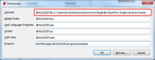 In the “Libraries” box is where we’ll add a link to the directory where the SparkFun EAGLE libraries are stored. There are a few options here. If you’d like to keep the default libraries and add the SparkFun library, add a semicolon (;) after “$EAGLEDIR\lbr”, and paste the SparkFun EAGLE Libraries directory location after that.