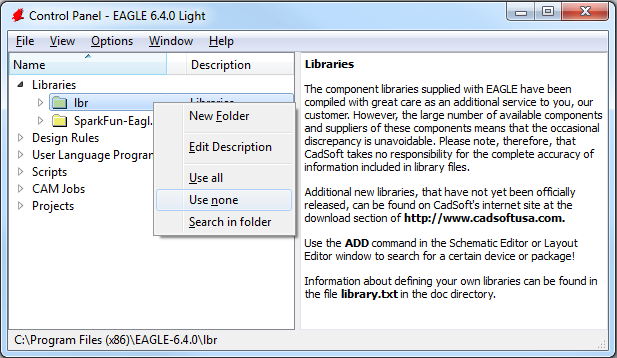 Now, when you go back and look at the “Libraries” tree, there should be two folders included, one of which should be our SparkFun Eagle Libraries. The last step is to tell EAGLE that, for now at least, we don’t want to use the default libraries. To do this, right click on the “lbr” folder, and select “Use none”.