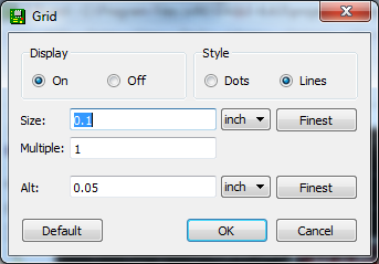 Switch the “Display” radio button over to “On”. We'll also make the grid a bit less fine by setting the “Size” to 100 mil (0.1") and “Alt” to 50 mil (0.05").