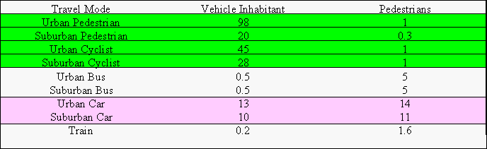 Human powered land transportation takes several forms and involves journeys of various lengths. Pedestrians and Cyclists are the two common groupings. "Pedestrians" can be expanded to include roller-blades and wheel-chairs, and "Cyclists" would cover all types of bicycle, tricycle and velomobile. In the urban setting of a European city such as Copenhagen, the average in-town journey is of the order of 4.5 km and the journey to or from the suburbs is of the order of 14 km. In these journeys, cars, busses or trains are the competing transportation modes. The safety of these modes (in 1993) is shown in the following table, where the number of deaths per billion kilometers is shown for both the vehicle inhabitant and pedestrians struck by the vehicle. While vehicle inhabitant rates are relatively high for both pedestrians and bicycles, these modes are of little danger to other road users. Automobiles cause much greater injury rates to others while reducing the vehicle inhabitant rate by about 30%. Clearly, public transportation is the safest travel mode for the passengers, but still carries a pedestrian hazard.